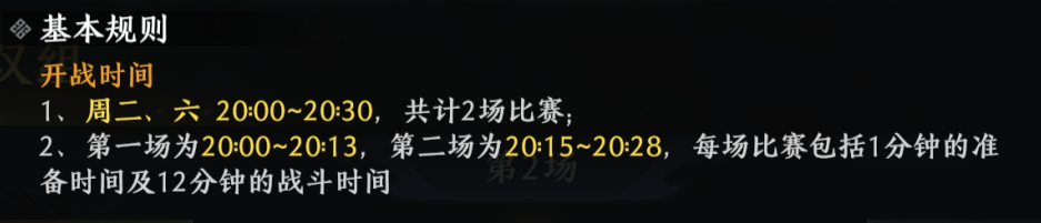 本次测试势力战的开启时间是每周二、周六的20:00-20:30,共计两场比赛。但是首期参与时,需要在周一5:00后或者周五5:00后,势力主公或太尉手动进行报名。(即:周二开始的比赛,周一5:00后可报名;周六开启的比赛,周五5:00后可报名。)