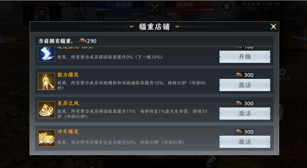 在辎重店铺中,可以选择升级各类属性,为己方参战成员、载具提供加成效果。升级操作可以在战场中随时进行,但需要注意的是,只有势力管理才能进行操作。