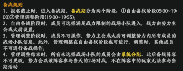 势力战布阵在19:55结束,势力要以该阵容连续对战两场,所以,势力的管理首先要在布阵结束时间之前完成人员分配,并且需要确保能参加活动的高战都分配在中央及码头战场。