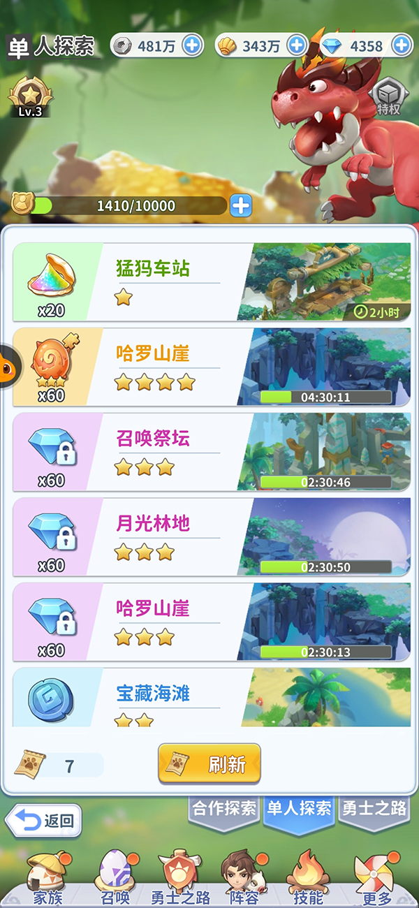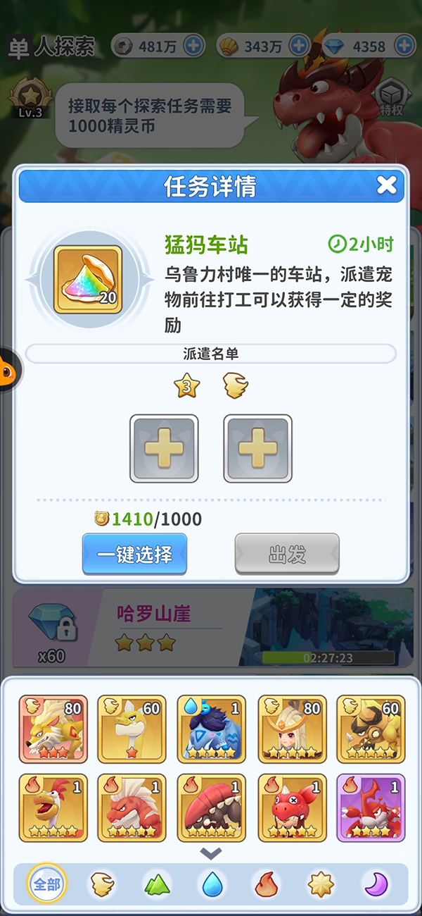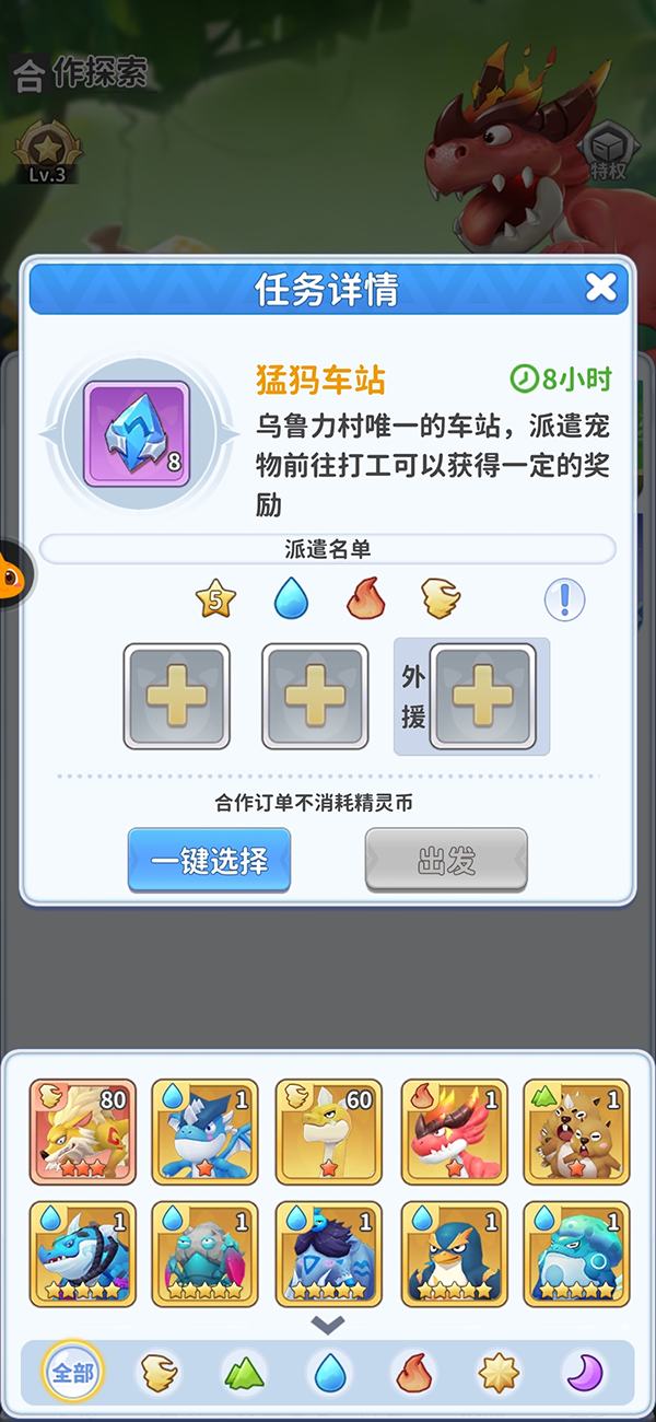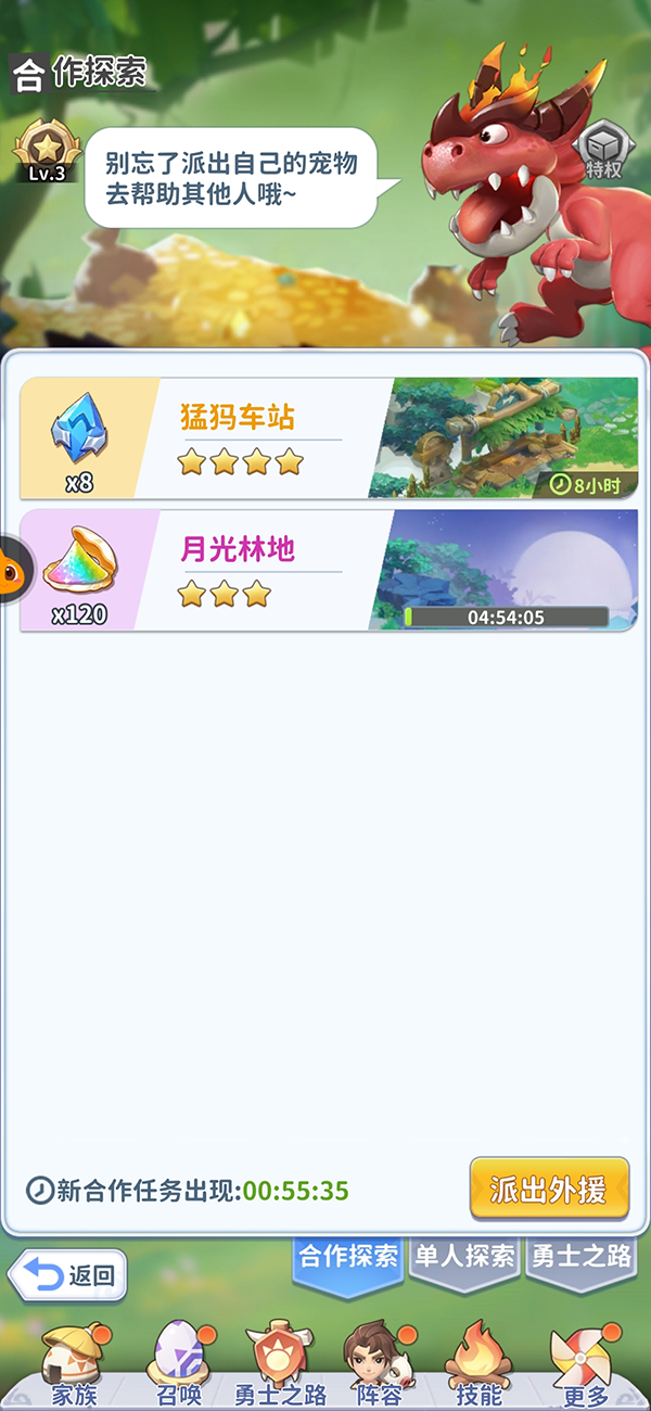 和单人探索的模式基本一致,但需要额外派遣自己好友或者家族成员的宠物作为探索外援,合作订单不消耗精灵币。
