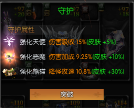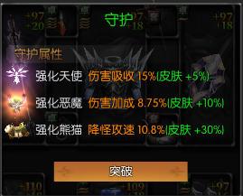 目前游戏内共有三类守护:天使、恶魔及熊猫,分别对应伤害吸收、伤害加成及降怪攻速,各有千秋。