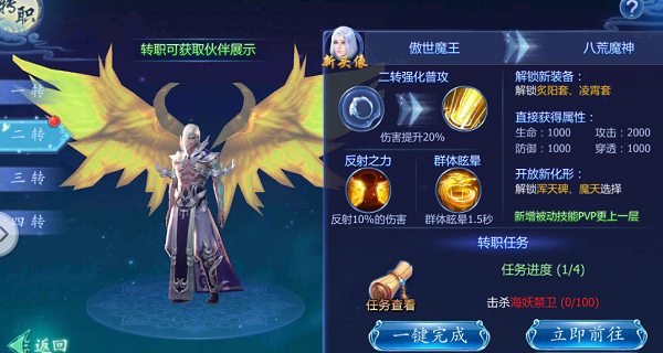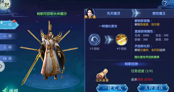 建议:我们如果想接到转职任务,我们必须努力把等级提升到150级,同时也要在这个过程中不断提高自身的战力,以便更好完成4个转职任务;而喜欢更为便捷的小伙伴们可以选择花费200仙玉立马完成转职任务,以取得新的外形,普攻收益和属性加成。