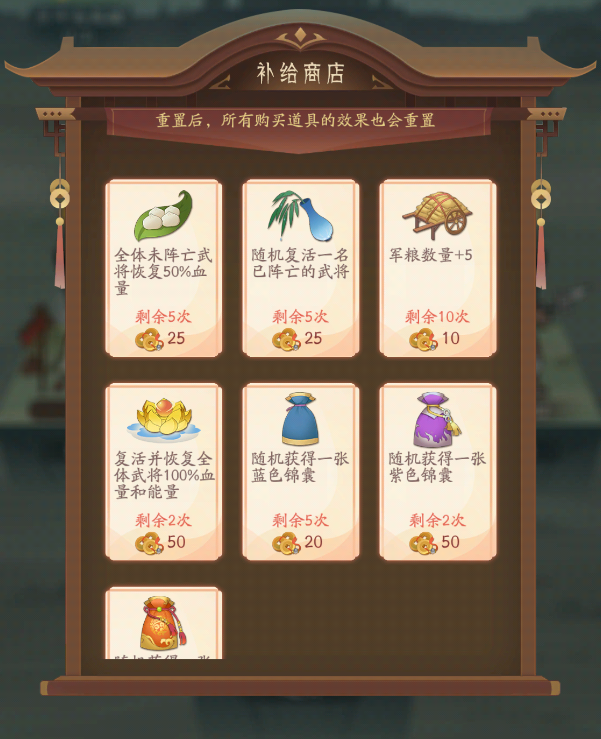 这里的军粮和铜币都是过关斩将的独有道具,并且会随着过关斩将的刷新而自动重置,因此大家不用担心某次军粮或者铜币用多了、下次就不够的问题。所以个人建议在保障抵达终点的前提下,可以用多余的铜币购买锦囊、提高队伍的战斗力。当然补给商店的商品也和军粮、铜币一样,会在刷新时自动重置。