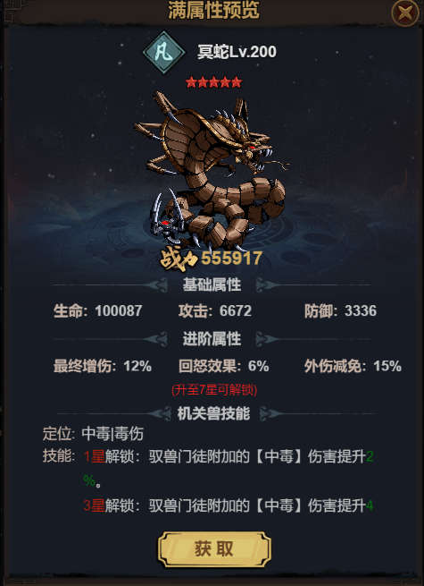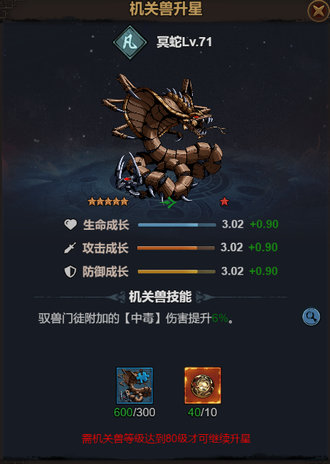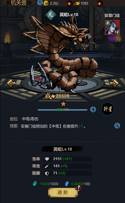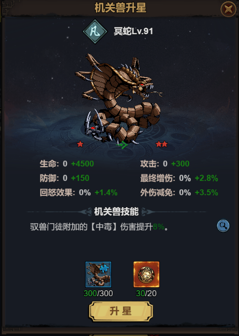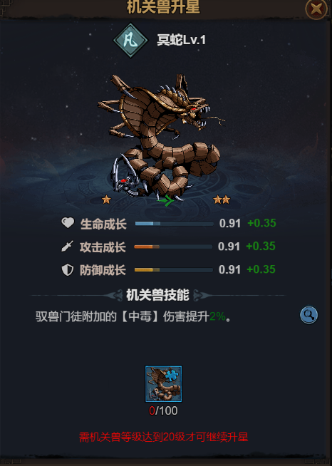 搭配门徒:乌凤、解春秋、天蛇女等、机关兽冥蛇技能主要增加驭兽门徒附加的中毒伤害提升,适合毒技能门徒的携带。