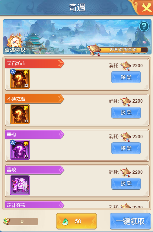 PS:道友们要注意每种任务都需要消耗一定数量的奇遇点哦,奇遇点通过挂机即可获得
