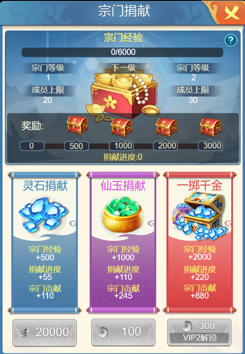 每个成员每天都可以在此功能版块进行捐献,向宗门捐献一次灵石或者仙玉(大大们量力而行~)