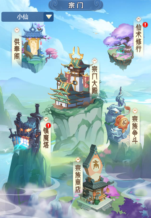分别是:供奉阁;仙术修行;宗门大殿;镇魔塔;宗族商店;宗族争斗