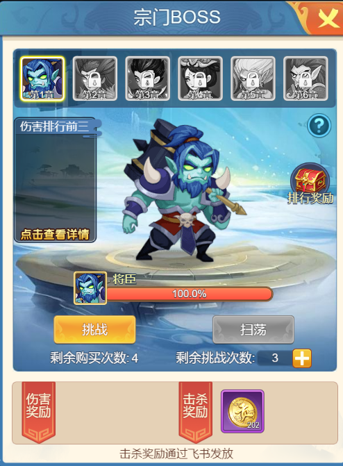 在这里,宗门成员可以一起对boss发起进攻,直到boss血量为0则为胜利