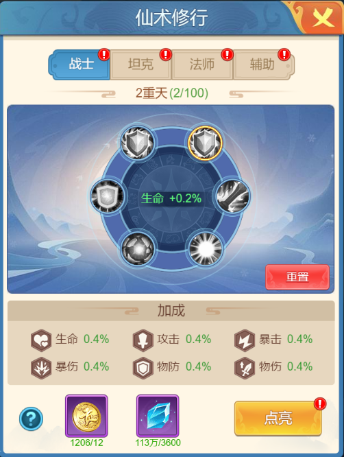 5、仙术修行:在这里宗门成员可以通过宗门贡献值和钱币点亮四个职业的属性