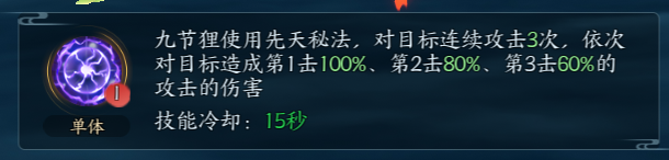 单体伤害,高频高伤,冷却短,在前期抢占竞技场与魔渊试炼的排名时,此妖灵是必不可少的抉择,中期也可作为对单体目标的次要输出点,更可以与其他妖灵进行1+1>2的配合。