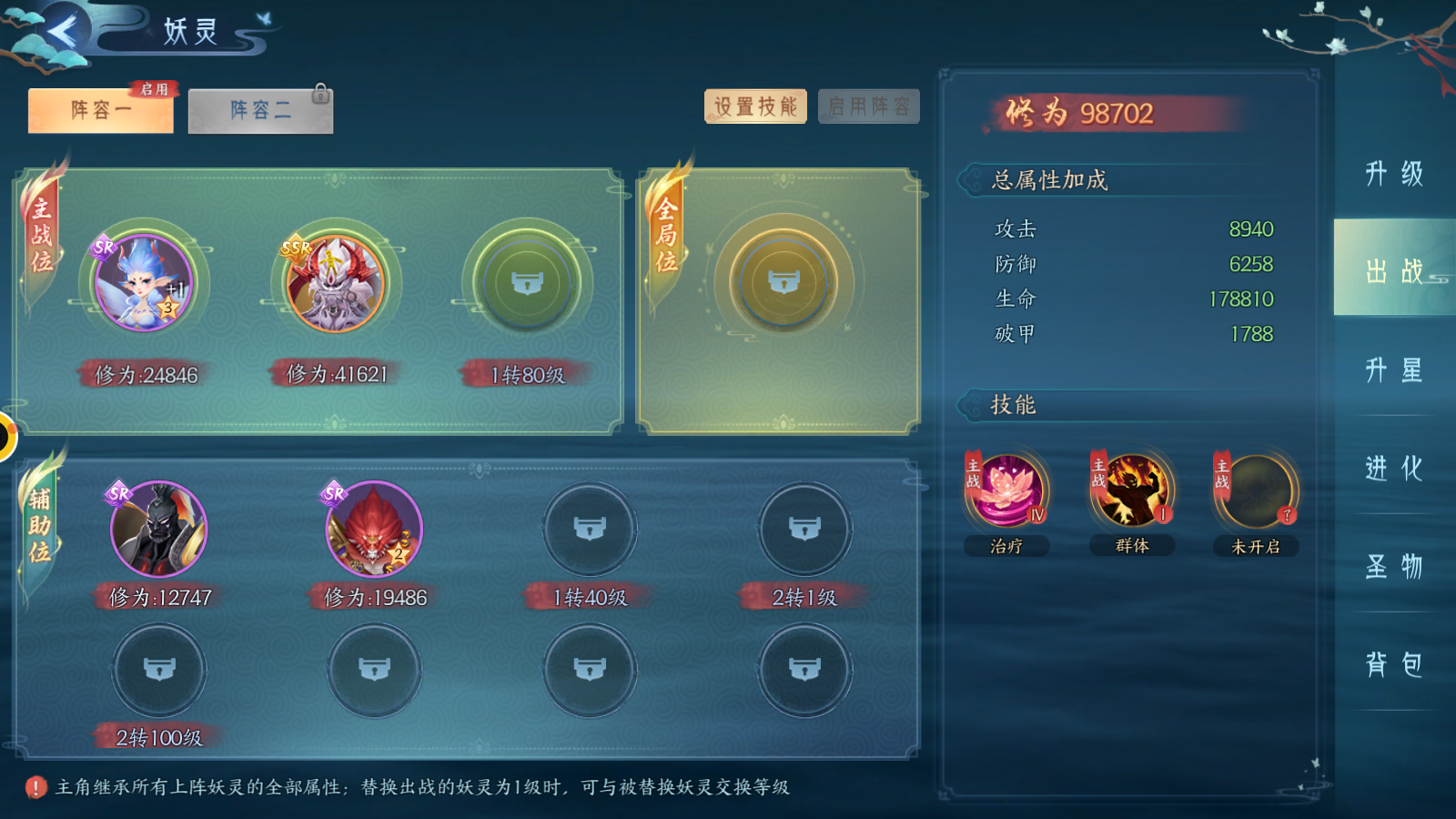 妖灵的出战人数与角色等级有关,达到一定等级时便会解锁出战位,每次解锁都是对战斗力的一次巨大提升。出战位分成主战位与辅战位,玩家会100%继承主战位与辅战位的妖灵属性,不过主战位的妖灵可以释放技能,而辅战位不能。妖灵可以随意升级,游戏有妖灵升级材料转移功能。获得更好的妖灵之后,可以把不要的妖灵经验转移过去,所以完全不用担心升错了妖灵,放心的升级高品质妖灵即可。