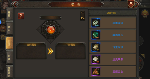 1.玩家需要通过除魔第一层才能激活血玉2.血玉可以增加永久性血量和魔法值装备;3.玩家可以通过野外挂机、装备会输可获得进阶材料。