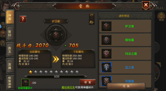 神盾1.玩家可以通过进阶神盾来提升人物物理、魔法防御力和韧性;2.玩家可以通过击杀boss、材料副本可获得魔、物防御的成长;