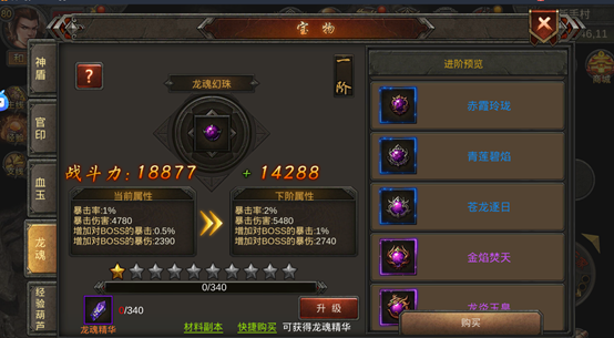 龙魂1.龙魂是可以提升人物暴击率、暴击力和对BOSS暴击、暴伤的装备。2.玩家通过刷boss和参加活动来获得进阶材料,玩家也可以通过商城购买龙魂碎片道具来快速进阶装备