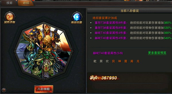 绝招系统也就是八卦系统,通过拼凑不同级别的八卦套装来加强自身的属性,每套八卦需要凑齐4件或者8件即可获得绝招技能加成。