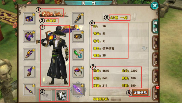 ⑥ 角色基本信息——依次为“角色ID”、“帮会”、“称号”、“签名”、“善恶”。其中“角色ID”是大侠遇到问题反馈客服需要提供的重要信息,请牢记哦。“签名”则可以根据自己的心情状态自定义呢。