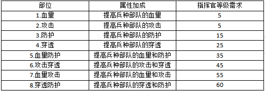 指挥官达到15级开放【配件车间】,配件根据兵种部队分为坦克配件、特种兵配件、自行火炮配件与火箭车配件,装备对应的配件后,该类兵种部队都会获得配件属性的加成。
