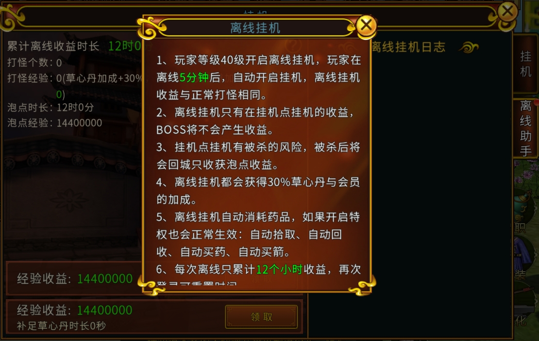 而且在空闲时间,可以选择在野外刷怪来获取打怪经验。达到40级之后正确设置离线挂机,每隔一段时间上线获取收益。