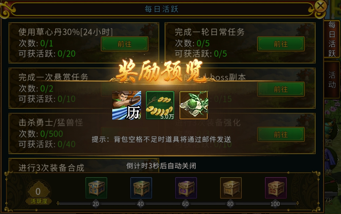 1、每日会开启活跃任务,完成任务获取活跃度可以额外领取活跃礼包