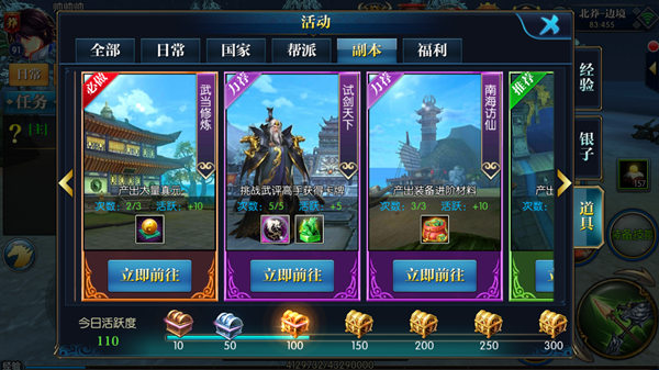 活动界面,副本,道具选择以后就可以看见试剑天下活动。