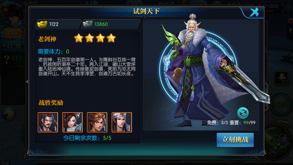 活动会有一个星级奖励,不同的星级对应不同品质的卡牌,一星最低,五星最高,要是将军不满意本次副本星级,可以选择右下角刷新选项,每天有3次免费使用的机会,3次用完以后,会收取少许银元宝作为刷新费用。刷新到将军满意的星级就快快挑战吧。