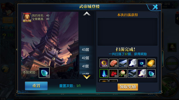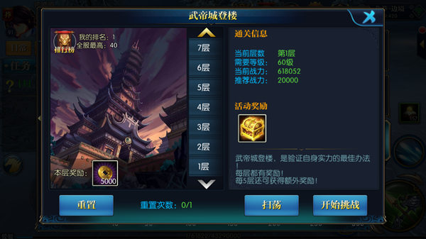 每天系统会有一次重置活动的机会,重置以后将军可以选择自己挑战,或者选择扫荡功能,扫荡会自动扫荡到将军攻克关卡最高的一层,不同的楼层需要消耗不同的时间,也可以使用加速扫荡功能,加速扫荡会消耗将军一定数量的金元宝。