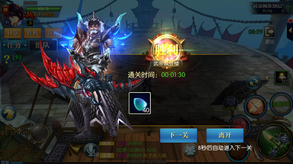 各位将军进入地图后,就可以参加战斗,将小怪全部消灭吧,关卡胜利以后就能获得各种物品了。胜利以后会有两个选项供将军选择,可以继续参加战斗,也可以退出提升实力之后再来参加战斗,不过将军要注意,10秒钟会自动进入下一关。