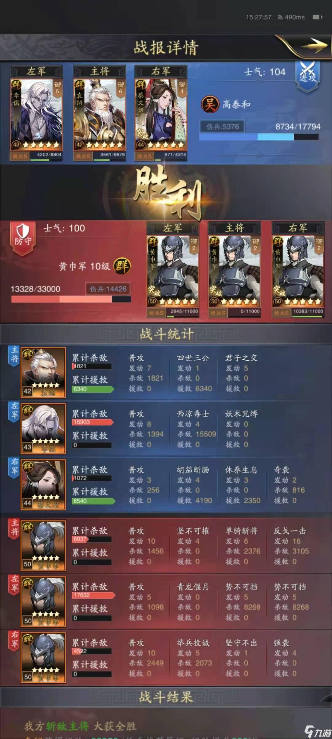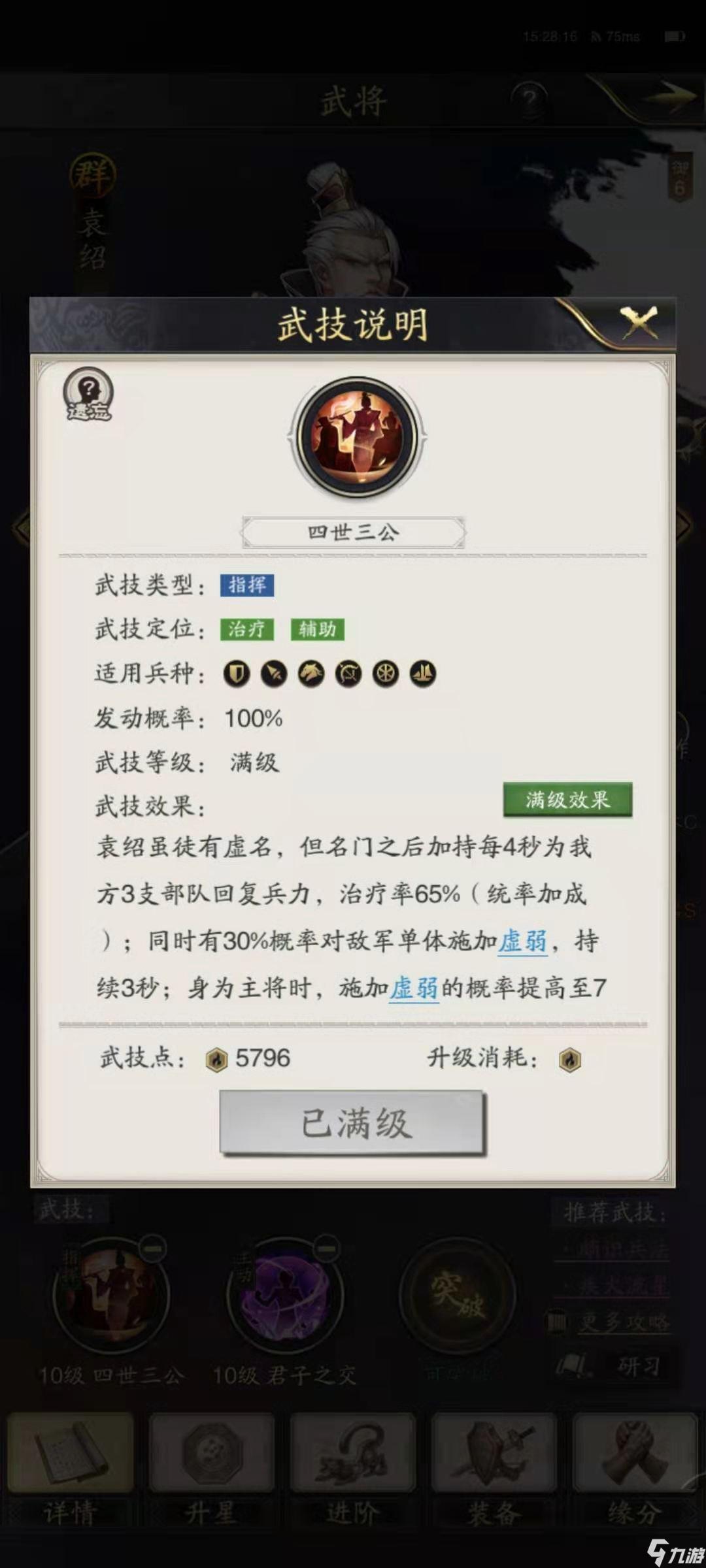 四世三公的效果是在四秒钟之内,为我方三只部队恢复兵力,治疗的数值是自身统率值的65%。而且还有对敌方有一定的概率施加虚弱效果,被虚弱到的敌人无法通过普攻和技能造成伤害,如果袁绍是队伍的主将的话,施加虚弱的概率会提高到70%。这个技能绝对是开局的神技,经过实战测试,四世三公在所有的治疗技能中都是数一数二的,加的非常猛。