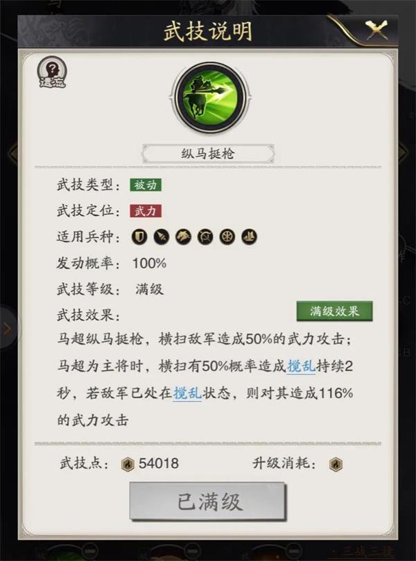 五虎上将,威震天下,全体武力、统率提高20点;在战斗9秒前使我军两支部队造成的伤害提高20%解析:全体增加武力伤害以及防御能力,战斗9秒前提高了爆发伤害。