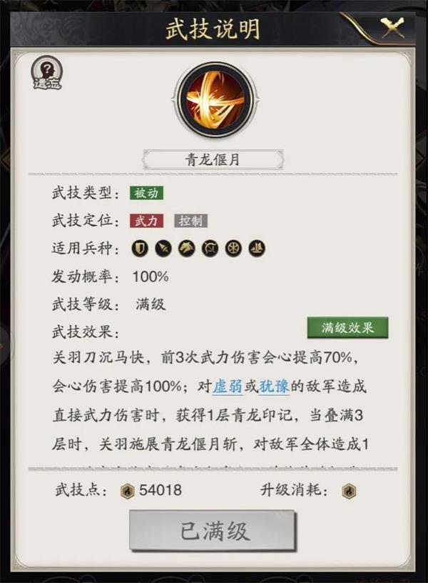 优点:暴力输出的代表,青龙偃月前三次的会心提高,会心伤害提高,搭配青龙偃月不俗的伤害,身为主将时青龙偃月还可以获得百分百的劝降