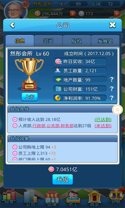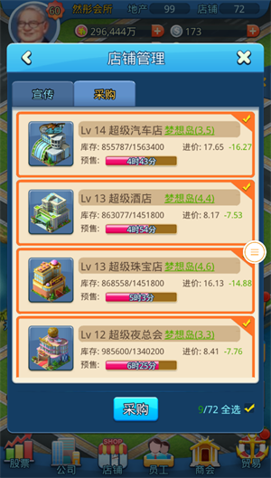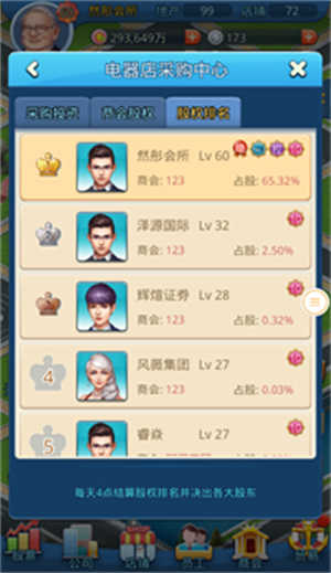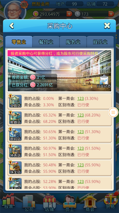 商会股权:占股排行第一的商会会长开启,减少商会成员30%的采购价格,提高其他商会20%的采购价格。(不与其它减免叠加,在其他减免后除去剩余采购价格的30%)