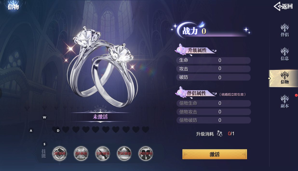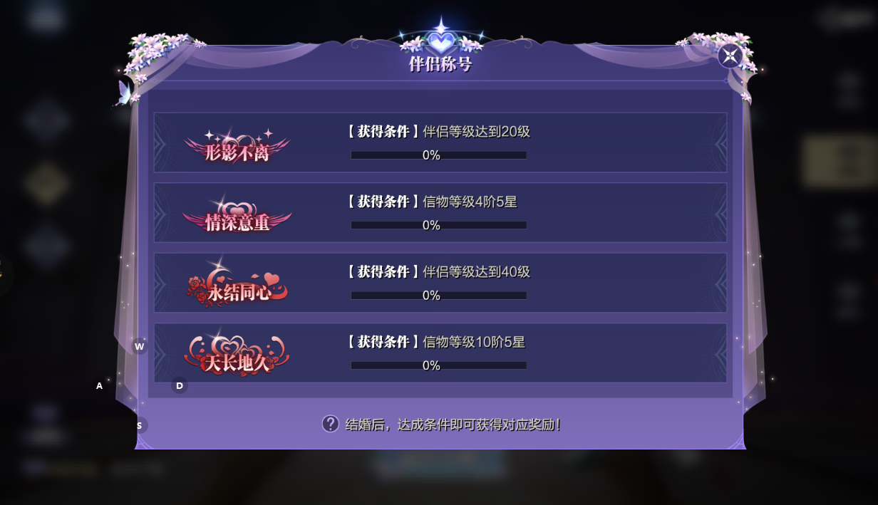 当然专属称号也是必不可少的,伴侣系统会根据伴侣等级和信物等级来奖励伴侣称号,信物等级为10阶5星时将解锁“天长地久”称号!到时候可就是真正的“老夫老妻”了。