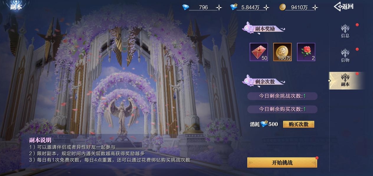 此外,以后的伴侣副本就可以邀请伴侣参加挑战了,再也不用为找不到异性伙伴而犯愁啦,在规定时间内通关层数越高获得奖励越多,不过每日只有一次免费挑战机会,想要获得更多挑战次数需要花费一点点绑钻购买~为了超值奖励,这点绑钻不算什么~