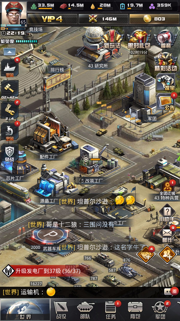 你们看,因为我们这个区开的时间也不长,跨服都没开始,七八配件的活动也没出来。而且我现在是在我们这个区的一团,基本上是天天打架,刚涨的战力很快就被打下来了。所以如果在高站团玩的话,希望大家多升级升级硬件,像科技、配件,能升级就升级。