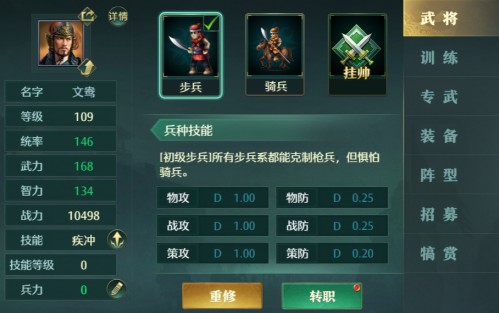 除了兵种的转职,还可以进阶强化兵种,强化需要材料,根据你想要的兵种强化所需要的材料进阶,强化的材料可以去精英副本中获取,也可以购买,一步步强化到最强的兵种,到一定等级还可以挂帅出征,有一支精锐部队,让你的部队越来越强大,各位主公们,一定要记住各兵种不同等级的属性加成也是不一样,兵种之间也是相互克制,还有不同站位的兵种可以说有着完全不同的战术价值,赶快去战火纷飞的三国战场上了留下了属于自己的铁血战史吧!
