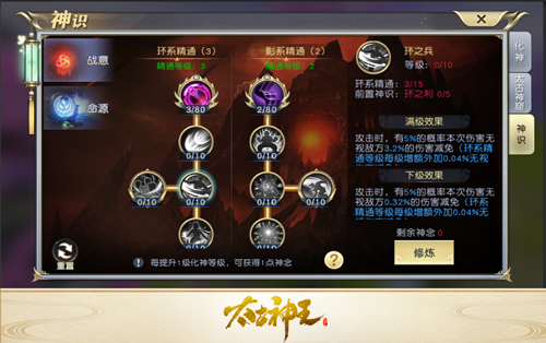 当玩家稳固了神阶修为达到化神10级后,就可以前往神域战场的神战遗迹副本,寻找上古至尊神族留下的神诀。8个不同部位的神诀搭配神核,组合之后可以激活10种不同的通神绝技。迷惑、致盲、伤害减免、血量上限提升……通神状态玩家属性暴涨又激活了这些强力特效,PVP中简直就是天神下凡一般。