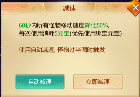 5.可使用元宝减速功能降低怪物移动速度,可选择手动开启或自动开启;