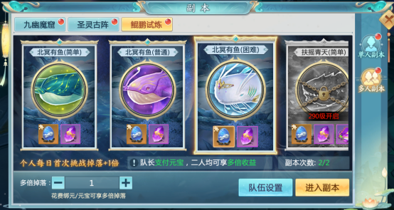 鲲鹏试炼为双人本,由队长开启房间,房间可设置密码,邀请亲密小伙伴一同前往挑战,队长也可设置副本掉落倍数;队伍共享哦!