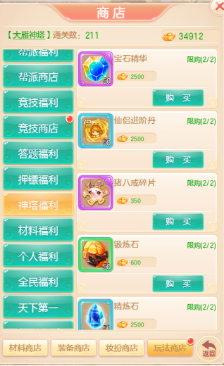 其次便是商城,在玩法商城里,有非常多的折扣,有好几项都是可以使用绑定元宝购买的,比如答题福利,押镖福利,神塔福利,材料福利,个人福利,全民福利以及生死劫商店,这每一个福利商店卖的物品都是不一样的,比如答题福利是称号,押镖福利是宠物卡,材料福利是各类经进阶丹等,折扣也不太一样,各位少侠可以根据自己的需求及身上的绑定元宝择优购买。