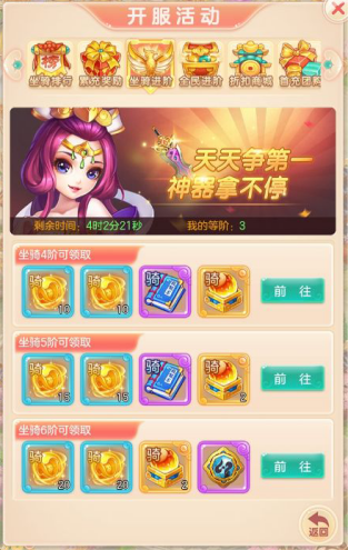 最后,不要忘了开服活动,每天都有排行榜活动,每日活动的系统达到对应的等级,便可领取进阶礼包和进阶奖励,在活动结束时如果再榜单前列的话还有非常丰厚的排名奖励。除此之外在还有对应的折扣商城,在有余钱的情况下,小编建议大家参与这个活动,消耗元宝升阶系统,竞争排名。