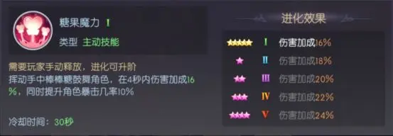 挥动手中棒棒糖鼓舞角色,在4秒内伤害加成16%,同时提升角色暴击几率10%