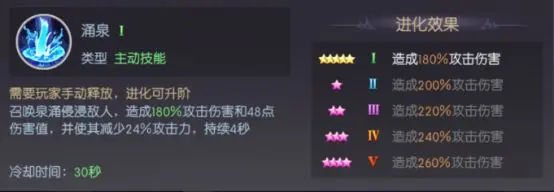 召唤泉涌侵浸敌人,造成180%攻击伤害和48点伤害值,并使其减少24%攻击力,持续4秒动速度减少28%,持续3秒 冷却时间:30秒
