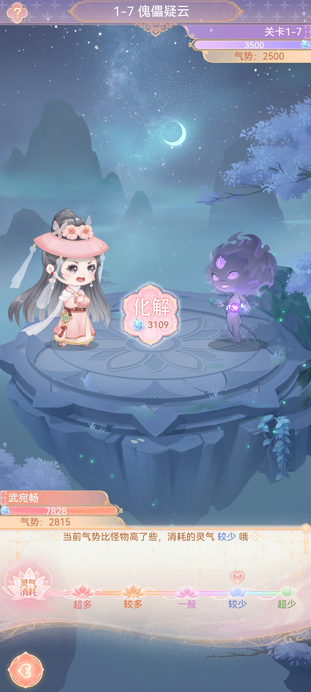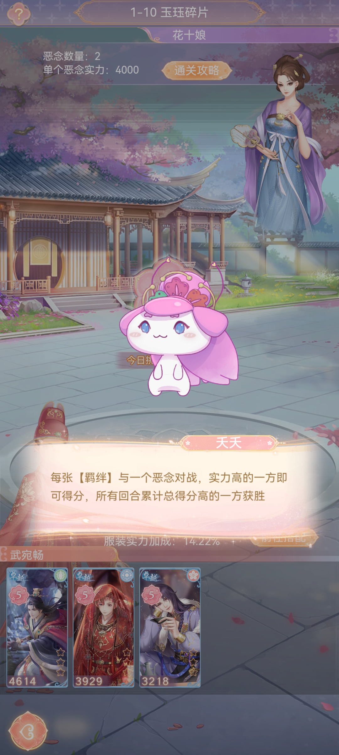 我们将通过羁绊卡和花十娘的恶念进行对战,由于我们的羁绊卡数值更高,而且数量比花十娘多一张,因此这关基本就是白给的,轻松取胜。
