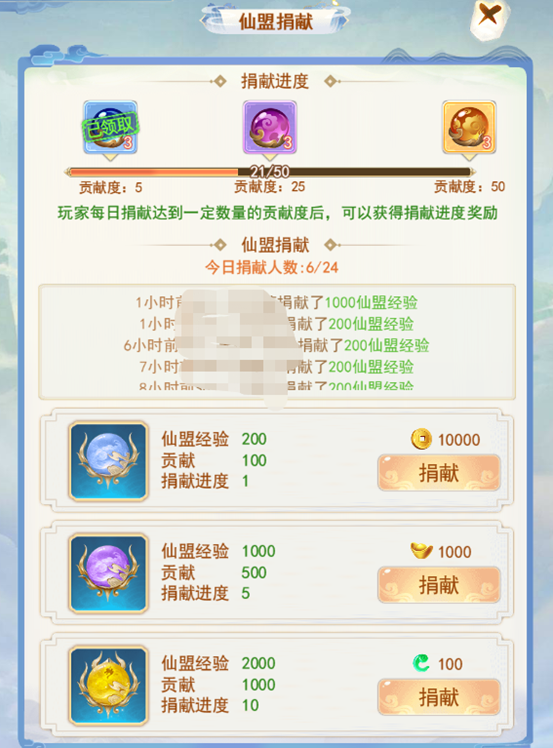 玩家每日捐献达到一定数量贡献度后,可以获得捐献进度奖励。