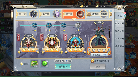 1.每次消耗20点体力,3星通关后可进行扫荡(使用扫荡符或2元宝)。