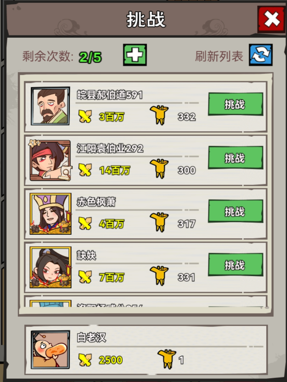 每个玩家每天有5次挑战次数,当次数用尽后,还可以花费元宝购买挑战次数。