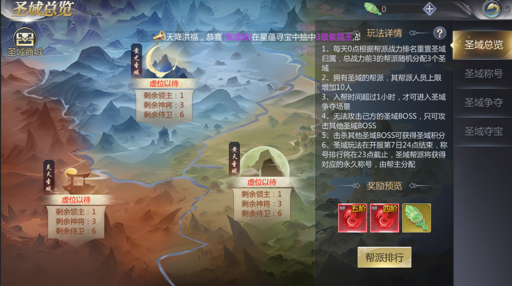 帮派豪侠齐聚圣域,总战力前3的帮派随机分配3个圣域,击杀其他帮派的圣域BOSS可获得圣域积分,对BOSS造成伤害最高的帮派,可获得该BOSS的积分,积分越高则奖励越丰厚。