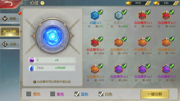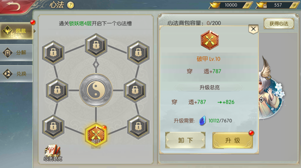 5.佩戴中的心法才可以升级,心法卸下后才可以进行分解