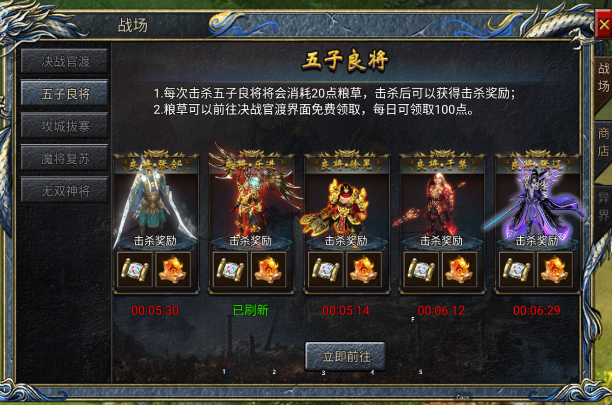②可以在决战官渡地图中击杀五子良将或者攻城拔寨来消耗粮草获得稀有道具和高级装备。