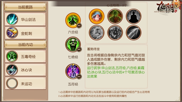 门派战和阵营战中平民和小R玩家可以选用冰心诀或混元功作为江湖内功,开启轰雷或者厚积薄发打输出,大r玩家用紫霞功开紫气东来心法恢复打持续战斗,副套路一般选择霓裳功或太极拳来恢复气血。